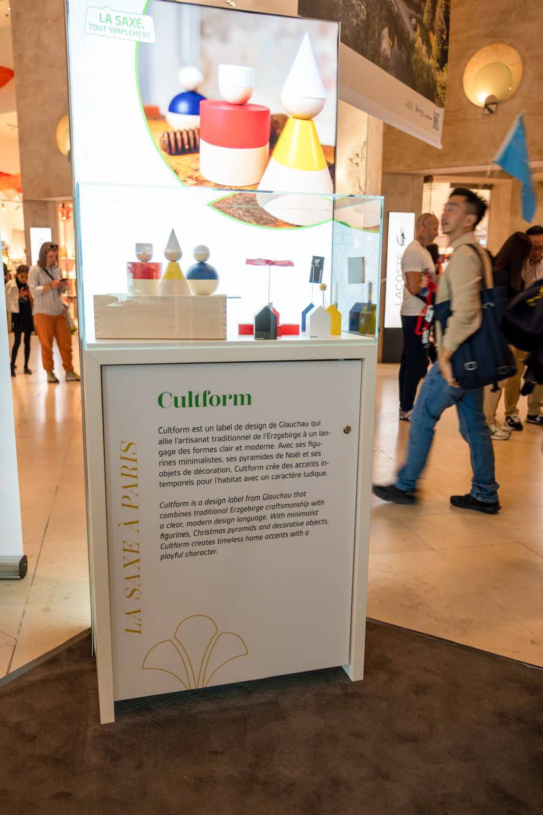 Im Pop-Up Store vertreten sind Meissner Porzellan, Herrnhuter Stern, Avantgarde, Nestler GmbH mit der Sonderedition »Paris«, Dresdner Whiskymanufaktur, Original Füchtner Nussknacker mit Sonderedition »Madame et Monsieur« Werner Spielzeug GmbH, Spielzeughersteller aus Seiffen und Cultform, minimalistische Holzkunst (Häuser und Figuren).
